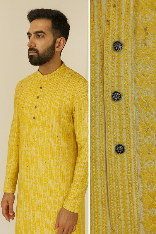 Pair this kurta with white pajama pants and tan or brown loafers for a timeless ethnic look. Add a stole or Nehru jacket for a more refined festive appearance.