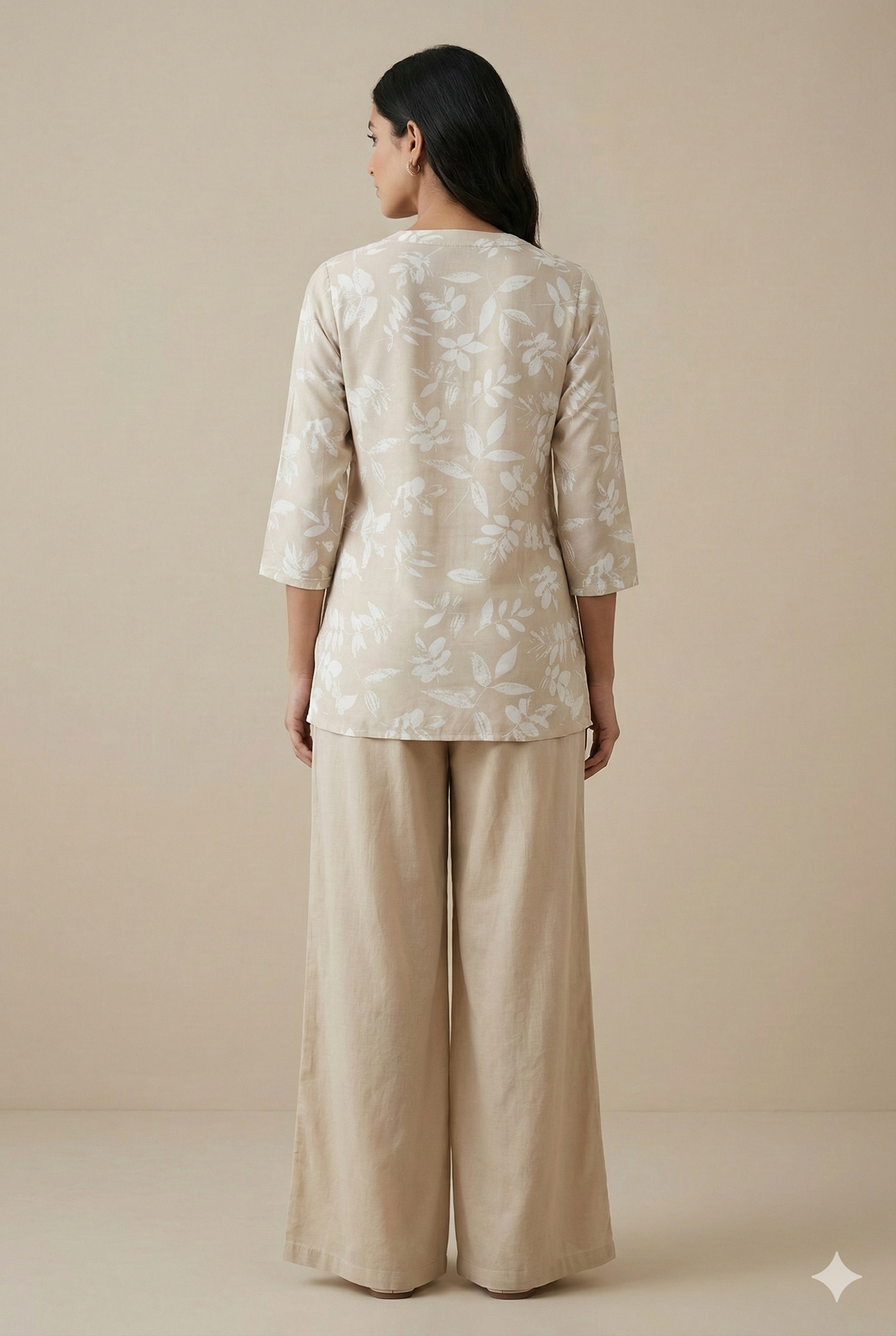 Beige Leaf-Print Casual Cotton Kurti with V-Notch Neck & 3/4 Sleeves - – Rocck'z index
