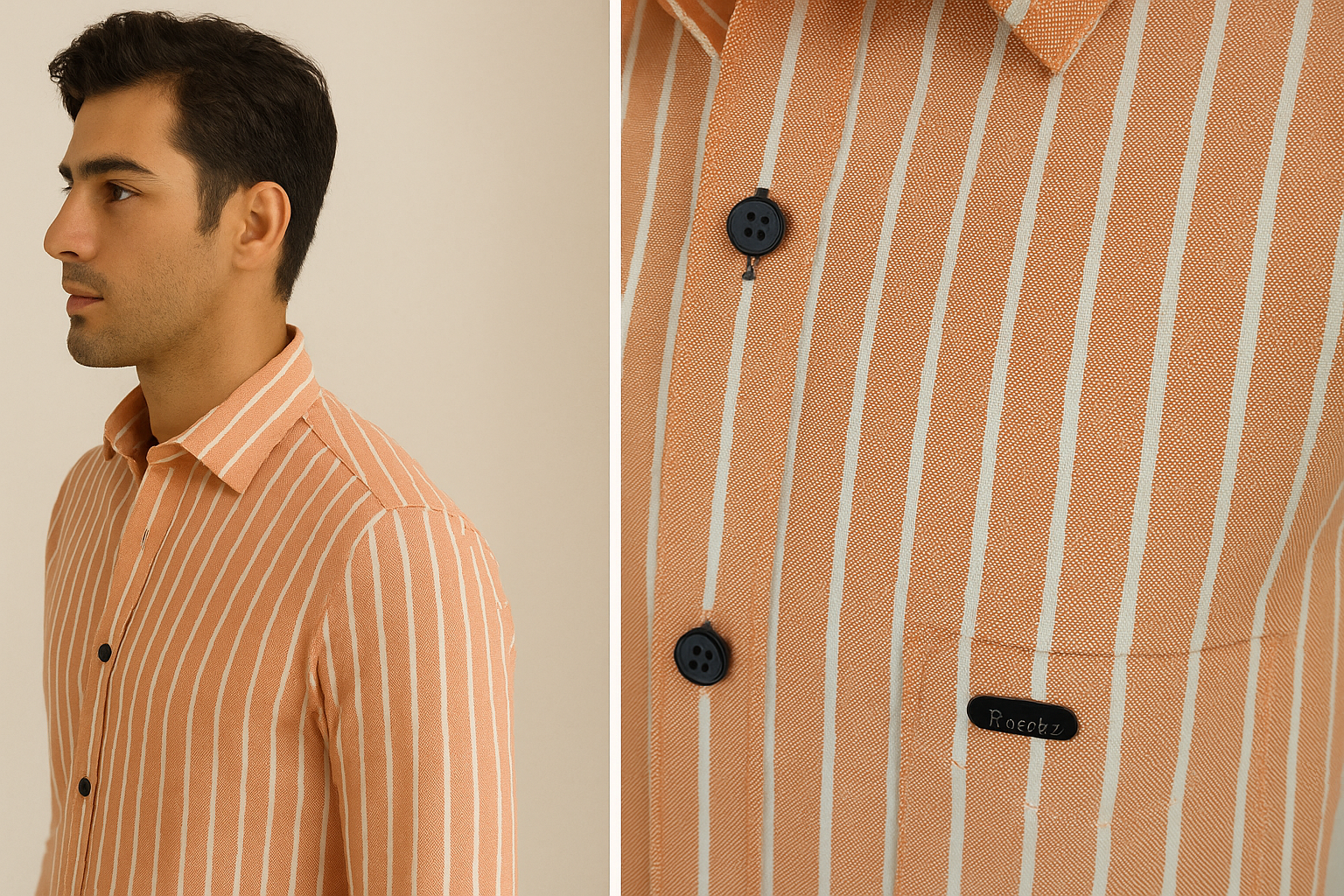 • Step into effortless style with this Rockz Men’s Orange & White Striped Casual Shirt, crafted from premium 100% cotton for unmatched comfort and breathability. The elegant vertical stripes add a modern, elongated silhouette, while the tailored fit ensures a refined, contemporary look suitable for any occasion.